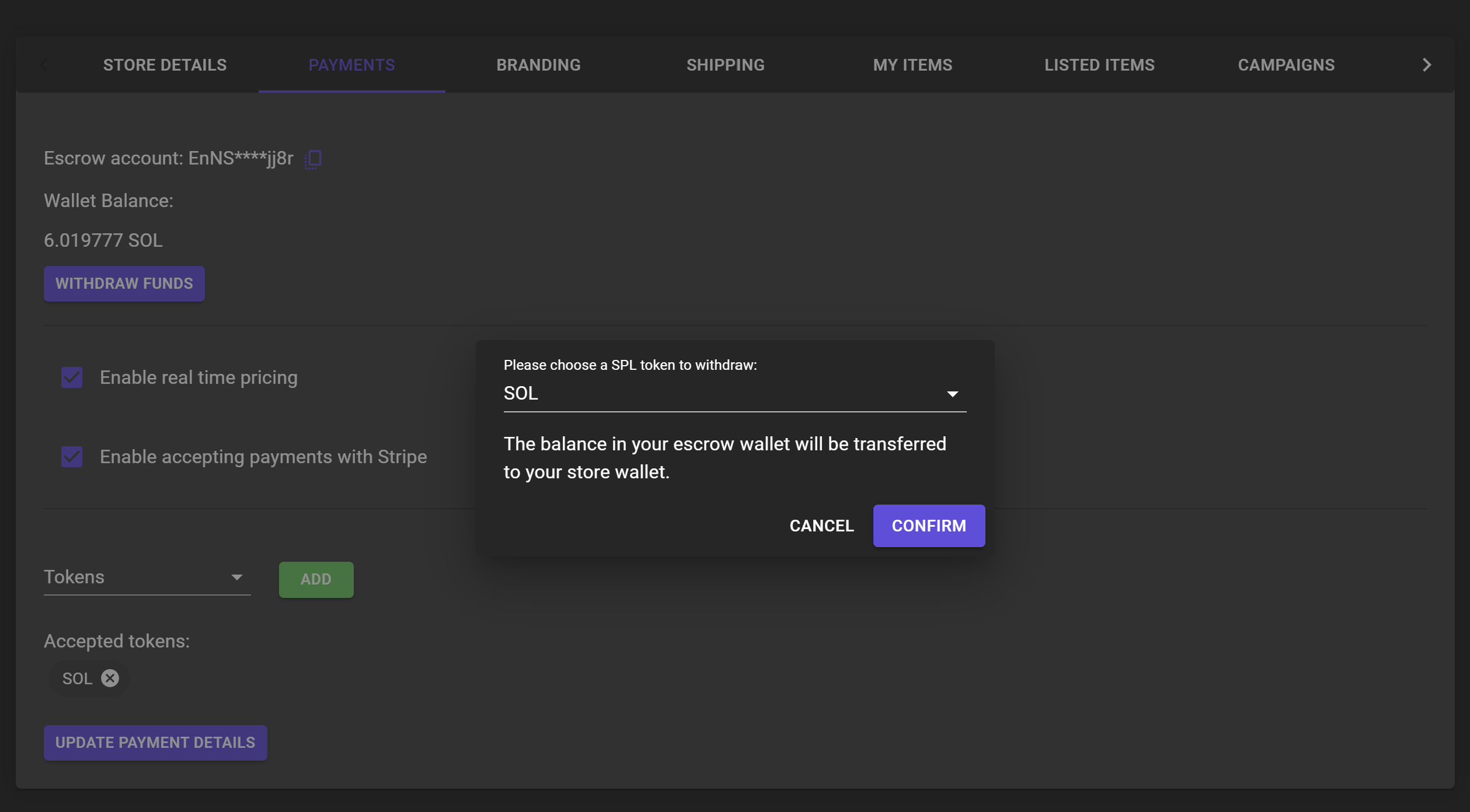 * Click "Confirm", funds will be sent directly to your store wallet