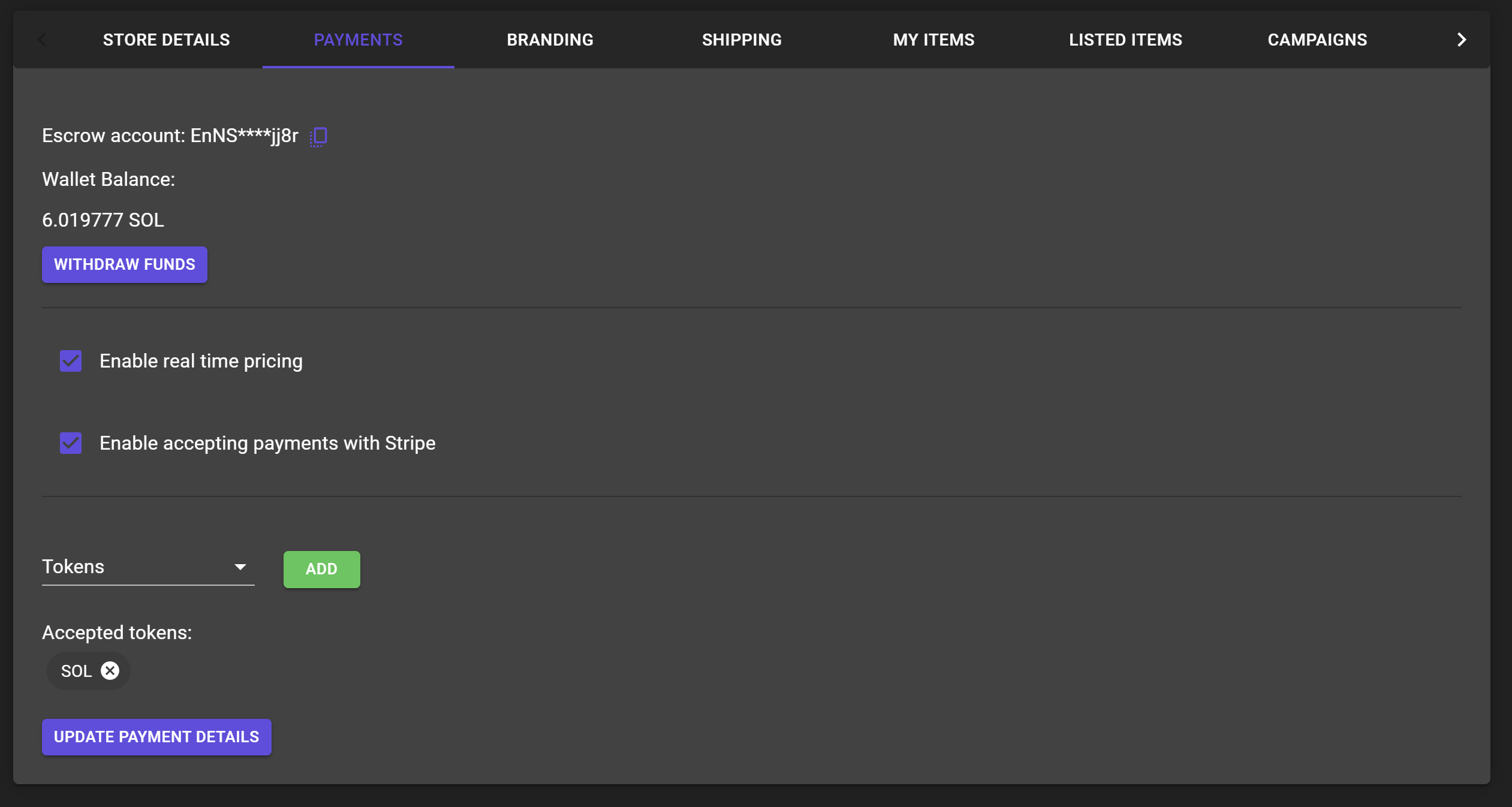 Please be sure to fund your escrow account with $SOL to cover Solana network fees